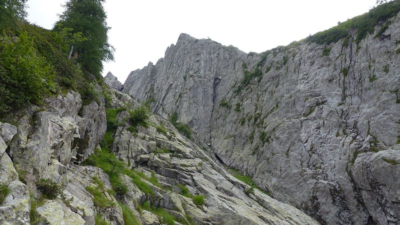 Der Abstieg durch schroffes und wegloses Gelände beginnt