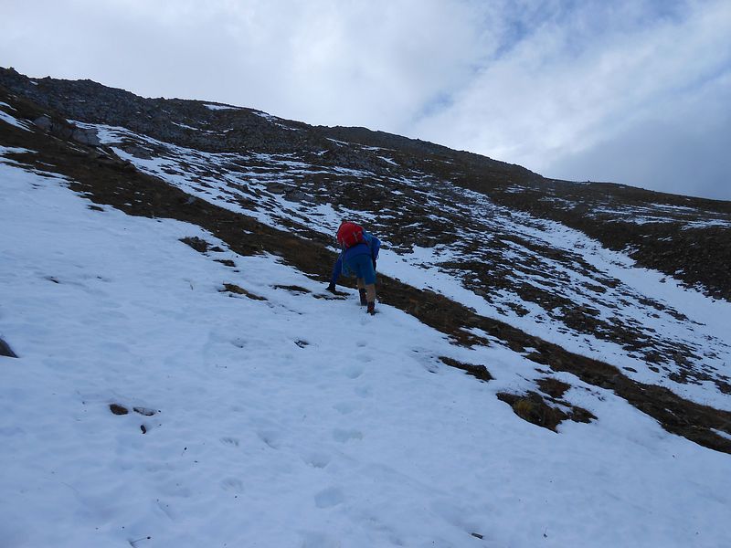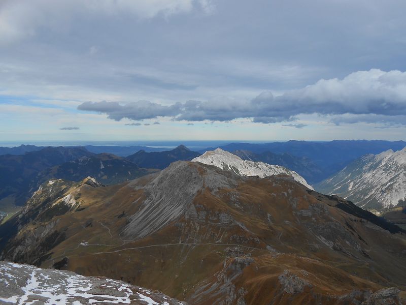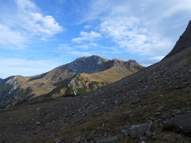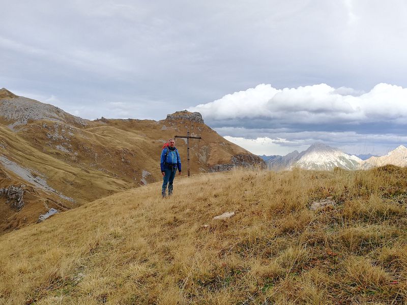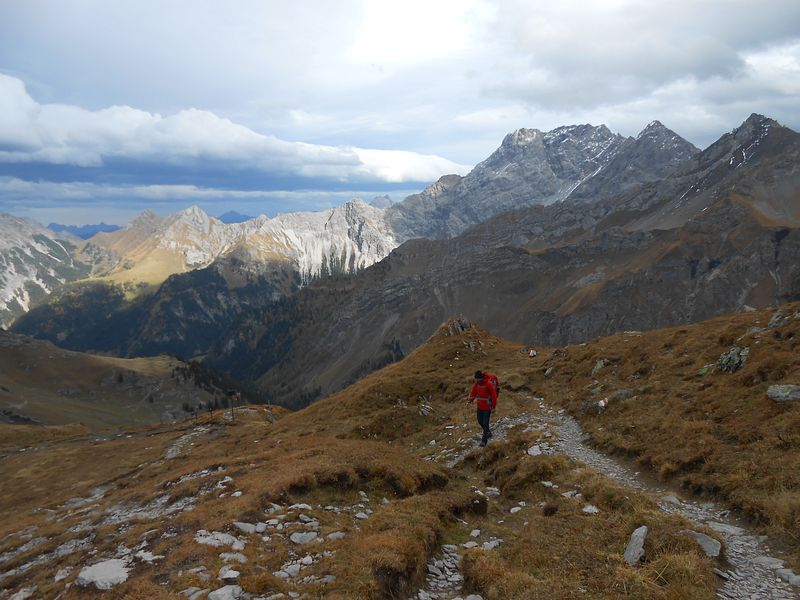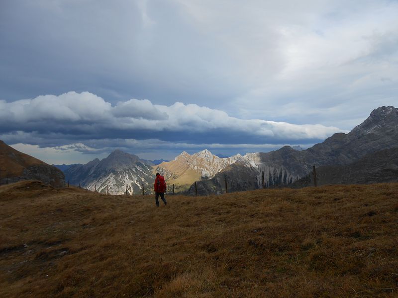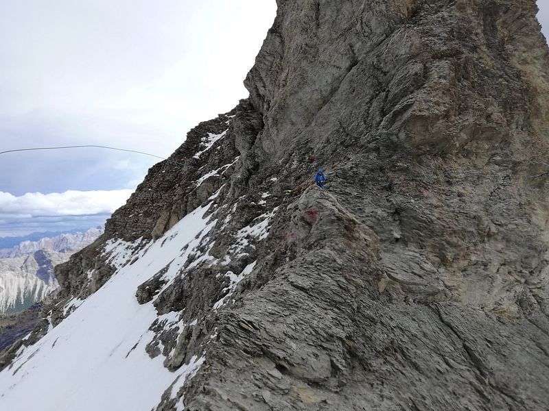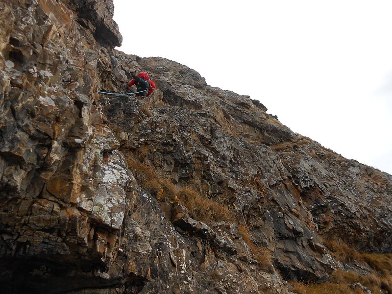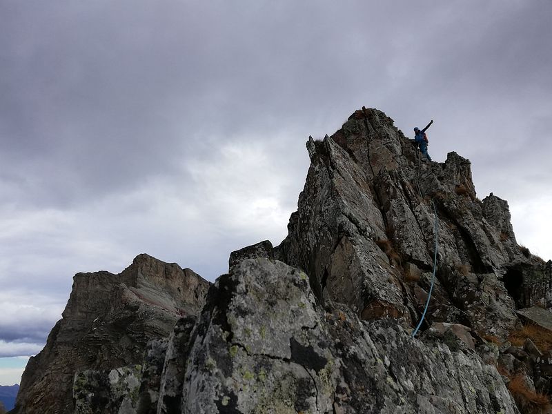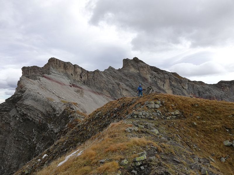Von da südseitig unterm gezackten Westgrat zum Einstieg. Auf dem